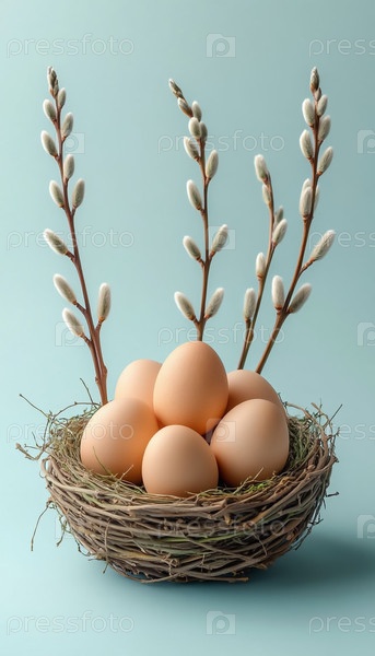 Минималистская Пусси Уиллоу и яйца Пасторальная сцена