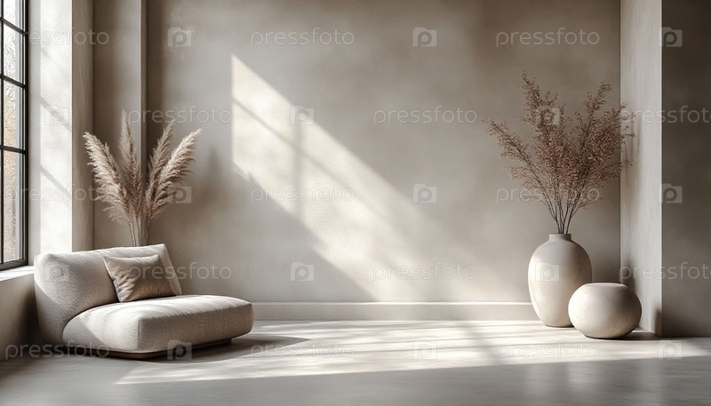 Минималистский интерьер с бежевым стенным пуфом и сушеной цветочной аранжировкой