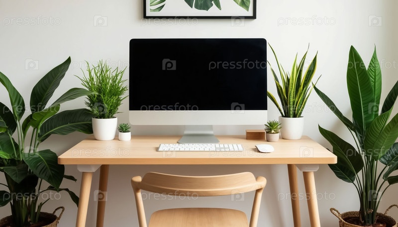 Монитор на деревянном столе против бежевой стены
