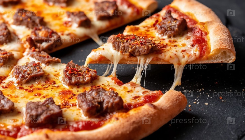 Мясо пиццы вблизи на черном фоне