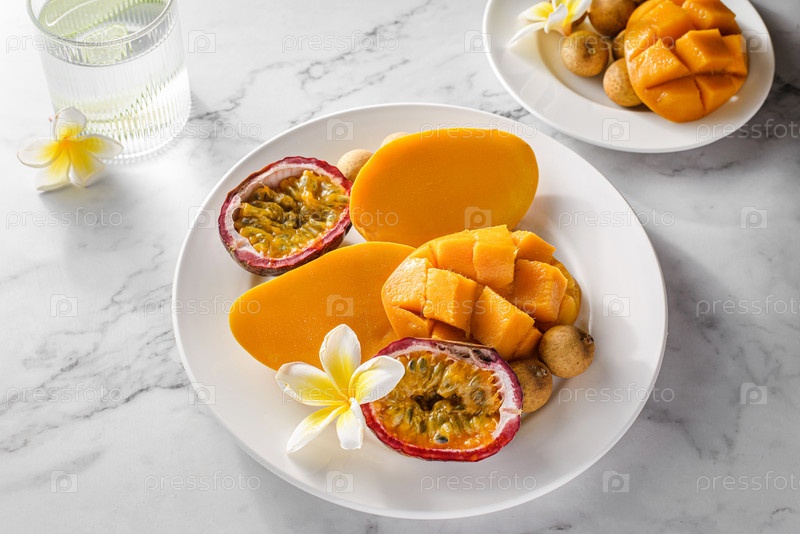 Манго и фрукты страсти на белой тарелке