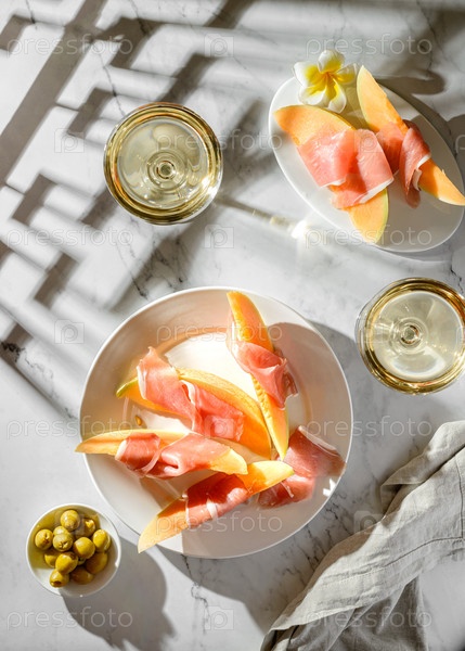 Мелон с пармой и бокал вина