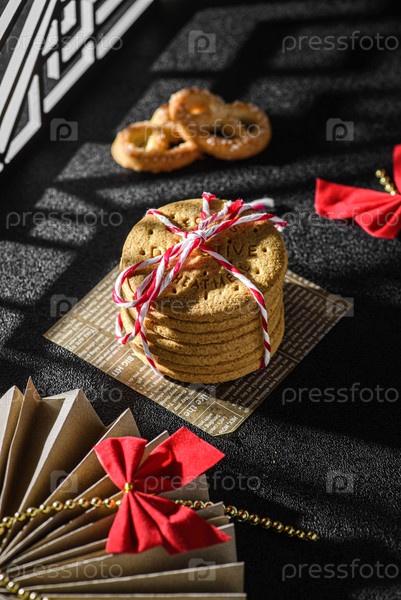 Стол печенья, связанный рождественской лентой