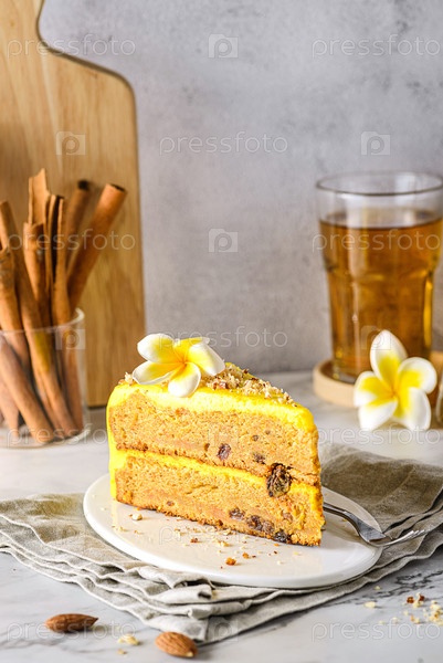 Кусок морковного торта с чаем