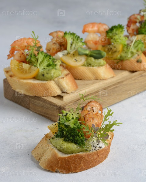 Брушетта с креветками и брокколи