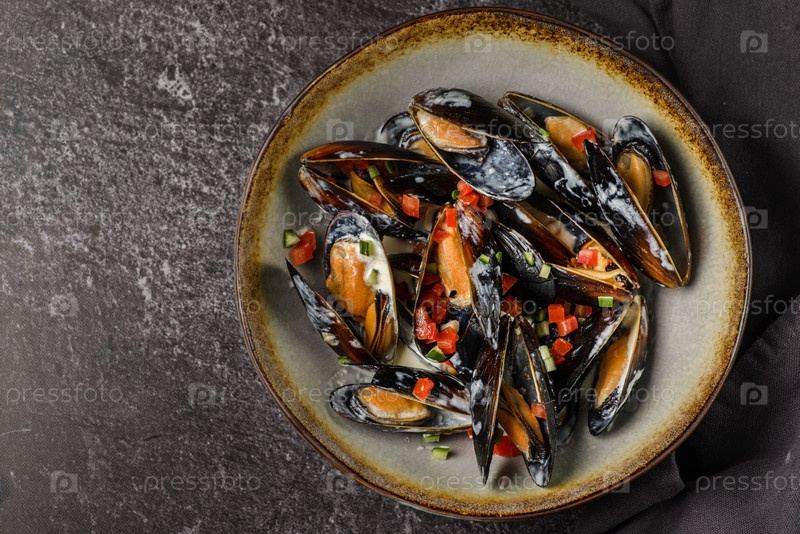 Мидии со скорлупами в томатном соусе
