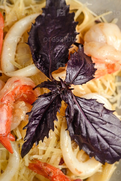 Макароны с креветками и кольцами кальмаров