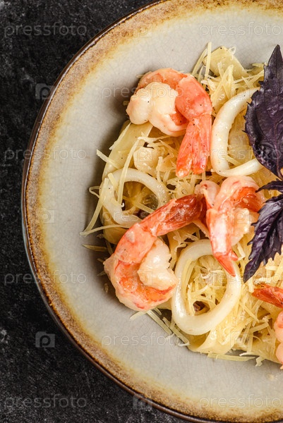 Макароны с креветками и кольцами кальмаров