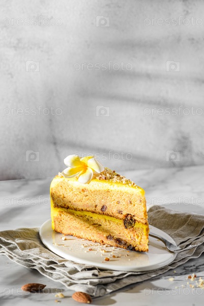 Кусок морковного торта на светлом фоне
