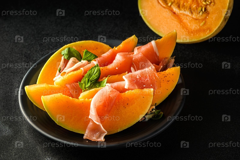Мелон с пармой на темном фоне