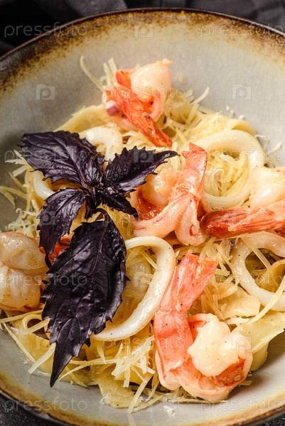 Макароны с креветками и кольцами кальмаров