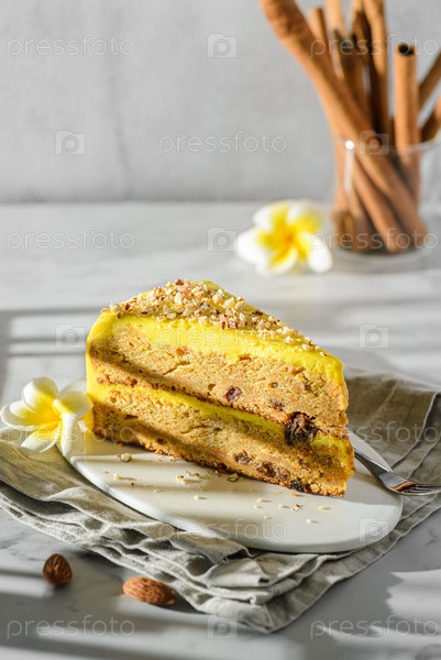 Кусок морковного торта на светлом фоне