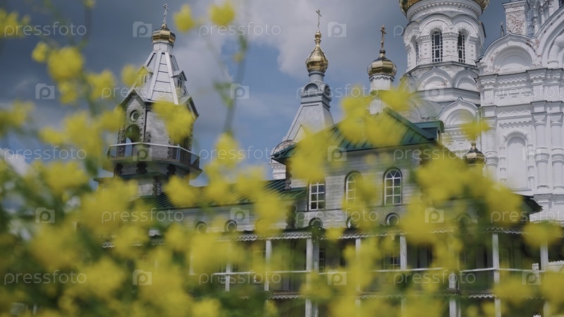 Желтые цветы на фоне красивой церкви летом. Клип. Близкий план цветков на фоне белой церкви или монастыря. Красивый пейзаж желтых диких цветов на фоне церкви в солнечный летний день