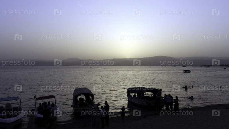 Спокойный закат солнца над водой с лодочной активностью, включающей в себя лодки на переднем плане