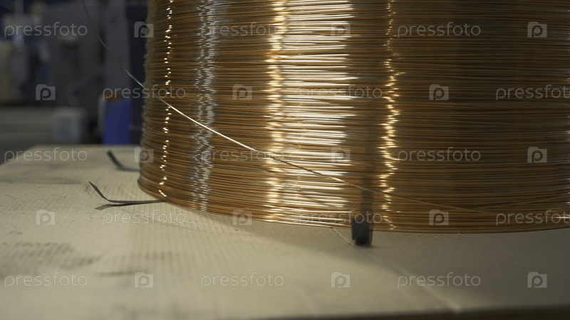 Близкий снимок раненого медного провода в производстве. креативность. тонкая линия проволоки на промышленной катушке. производство медных проводов на металлургическом заводе