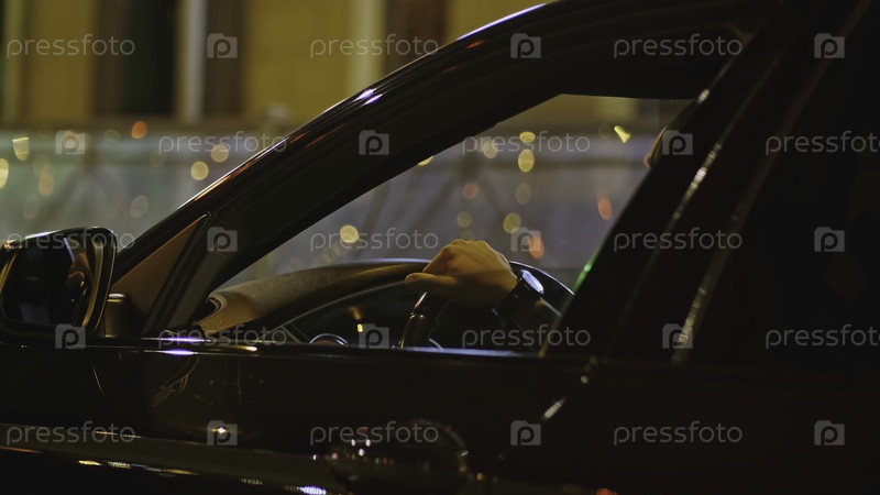 Рука мужчины за рулем машины. Клип. Вид из окна автомобиля с человеческой рукой на рулевом колесе. Богатый человек, едущий в машине в ночном городе