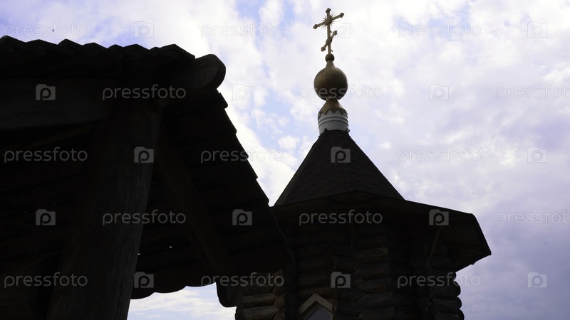 Древняя деревянная архитектура церкви. СМИ. Деревянные здания древней церкви на фоне неба. Древняя деревянная церковь с крестом