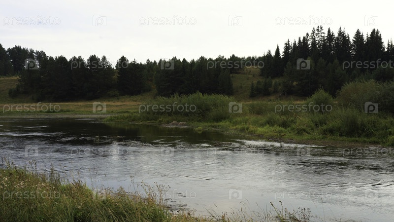 Красивый летний пейзаж реки и луга с лесом. СМИ. Рустический ландшафт рек и лесных лугов. Река со зеленой травой и лесом