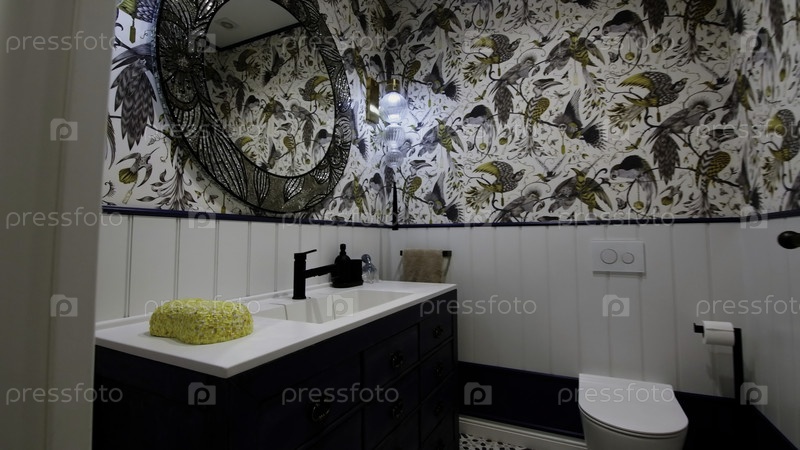 Современный домашний интерьер ванной комнаты.Креативные.Белые плитки на стенах с цветочным узором и птицами