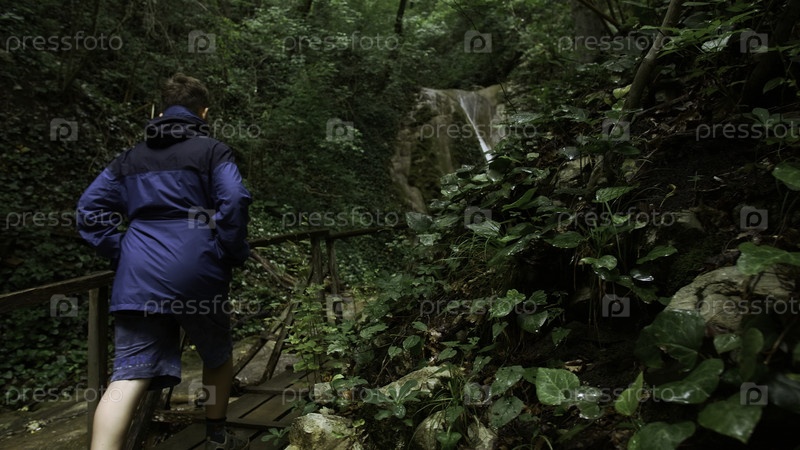 Мальчик-путешественник, идущий по лесу на деревянном мосту