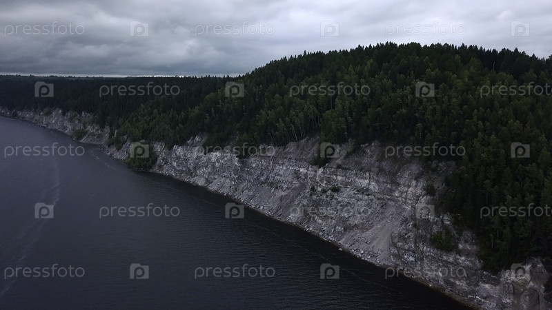 Вид с воздуха лесистой скалы и большого голубого озера.Клип.Удивительный водохранилище и зеленые холмы