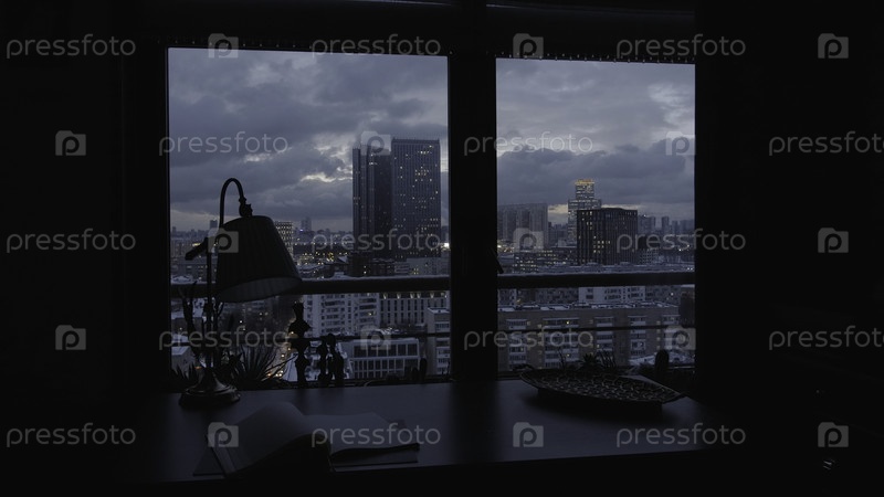 Концепция работы в домашних условиях.Креативность.Большой город за окном, дневник и декоративная ваза на столе