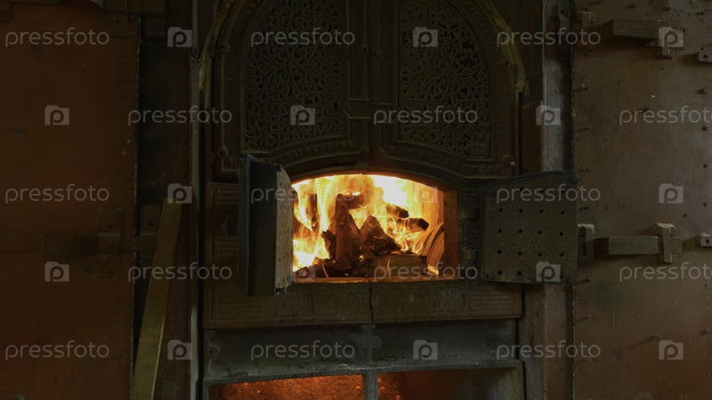 Старая плита с дровами летом. Действие. Красивые двери печи в стене с огнем. Наружная плита с горящей древесиной внутри в летний день