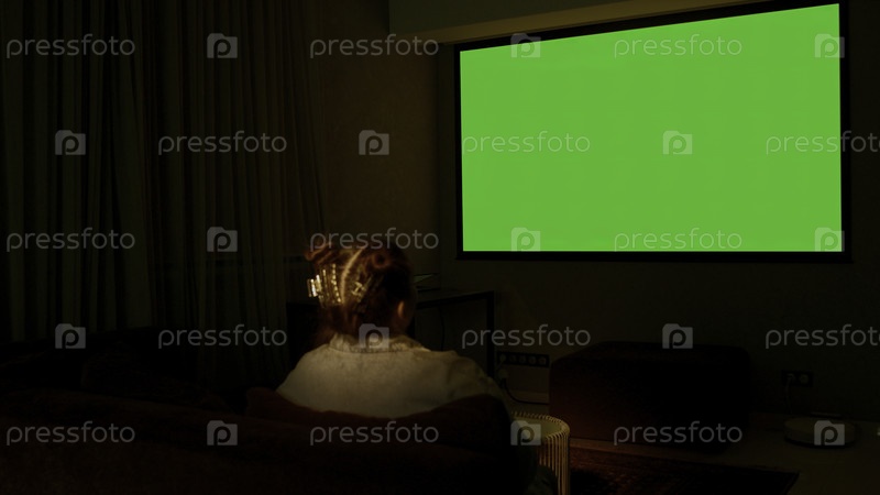 Женщина смотрит телевизор в гостиной поздно вечером СМИ Молодая девушка сидит на диване против телевизора с хрома ключом зеленый экран, задний вид