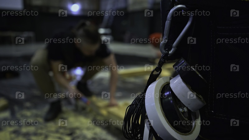Плотники, использующие профессиональное оборудование на мастерской.СМИ.Работа с деревянными балками