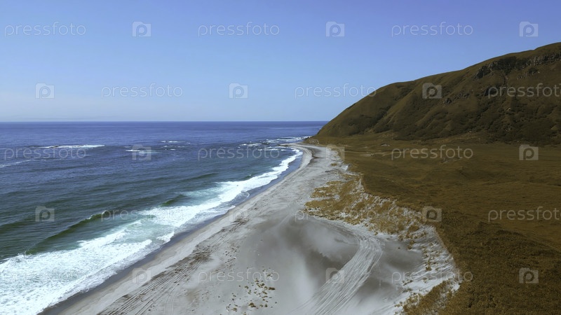 Песчаные дюны, заросшие желтой травой на берегу океана. Клип. Вид с воздуха обгоревшего луга и бирюзового океана