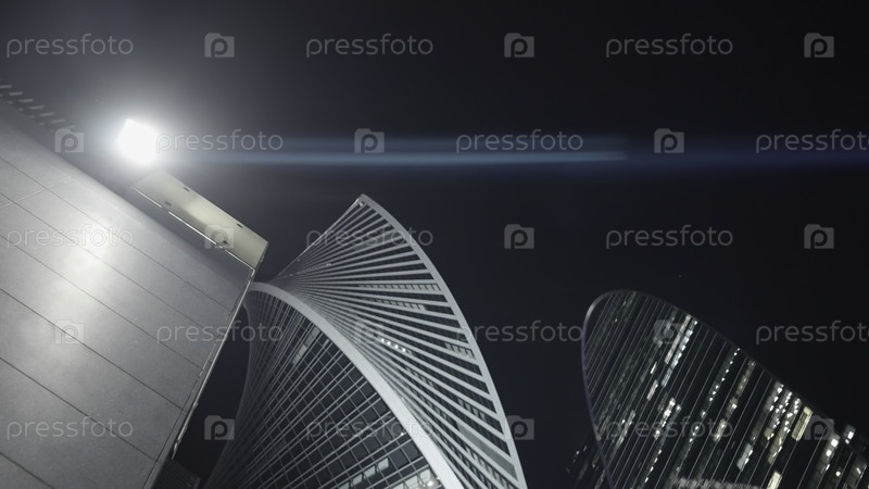 Вид снизу фонарей и современных небоскребов. Действие. Яркий уличный светильник на здании на фоне небоскребов. Современные стильные высотки ночью