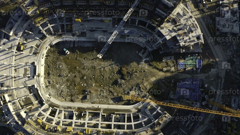 Вертикальный взгляд сверху на строительство круглого здания. Снимок акций. Строительная площадка здания недалеко от парковки в центре города. Строительство стадиона в центре жилого города в солнечный летний день