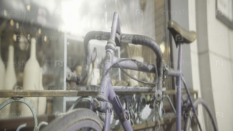 Винтажный велосипед с цепью в магазине. Акция. Антикварный велосипед стоит у окна магазина. Старый ржавый велосипед стоит снаружи здания в солнечный день