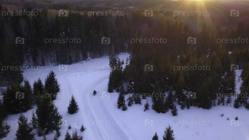 Зимний снежный солнечный день. Вид с беспилотника. Клип. Яркая зима со скутером, едущим по дорогам и зеленым елкам. Высокое качество 4k кадры