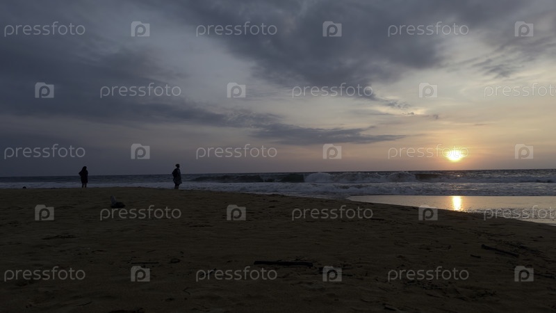 Люди стоят на песке с видом на закат моря. действие. люди смотрят на закат с песчаного берега. красивый пейзаж с людьми на песке на фоне волн и захода солнца