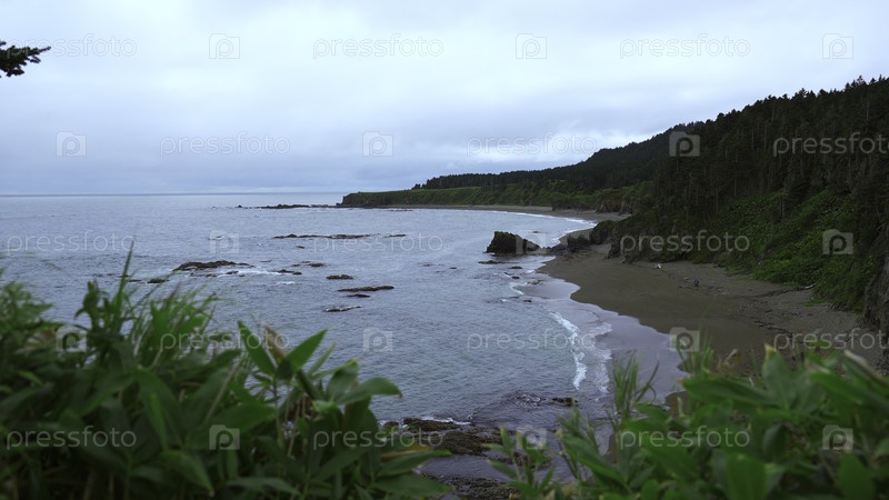 Красивое скалистое побережье с зеленью в пасмурную погоду. Клип. Вид сверху живописного пейзажа южного морского побережья со скалами. Зеленое скалистое побережье в пасмурный день