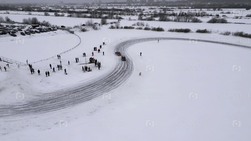 Зимняя трасса во время гонки, вид с беспилотника. Клип. Аэрофотосъемка автомобилей, едущих по снегу и ледяному озеру