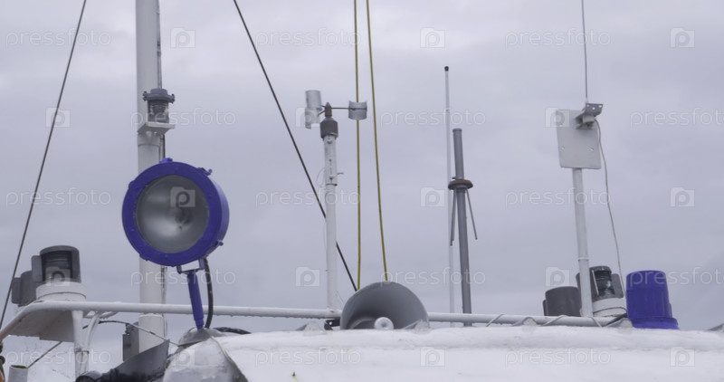 Лодка с антеннами и ярким синим светом ориентируется в окружающей среде