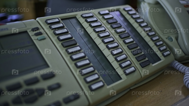 Стационарный телефон в старомодном офисе.Клип.Человеческий палец, нажимающий кнопки на стационарном телефоне с пусковой кнопкой