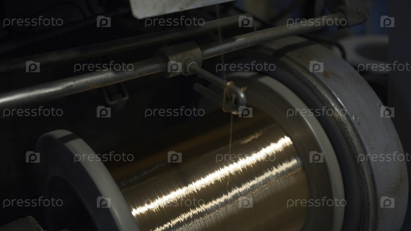 Ближайшее изображение катушки обмотки медного провода. креативное. блестящий медный провод закручивается на катушке в металлургическом заводе. производство медных проводов
