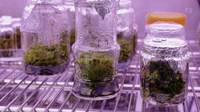 Ближайшее изображение микрозеленых растений в контейнерах в современной теплице на фоне полков. Скриншоты. Лабораторное оборудование