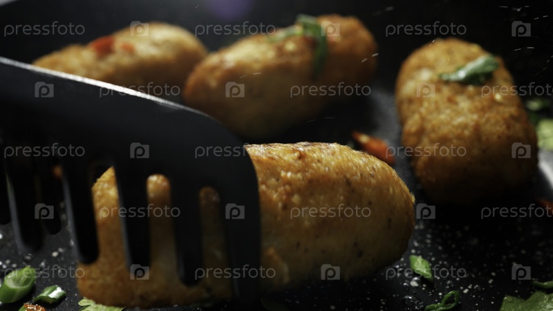 Процесс приготовления пищи, запасной материал, жарка мясных котлет с овощами в горячих сковородках