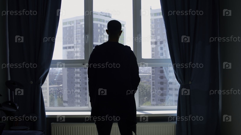 Мужчины, разговаривающие по телефону в комнате СМИ Молодые силуэты мужчин с задней части квартиры смотрят из окна издалека Высокое качество 4k видео