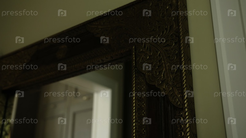 Золотая ретро-зеркальная рама, ближайшее изображение. креативное. винтажный интерьер со зеркалом в красивой раме