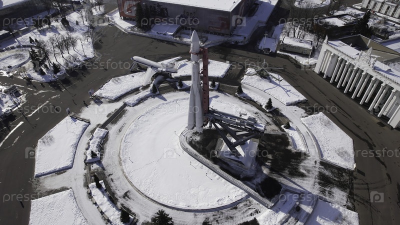 Вид сверху на ракетный памятник зимой.Креативное творчество.Памятник ракете на городской площади в солнечный зимний день.Масштабный монумент космическому полету с ракетой на площади