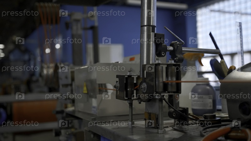 Изолированные медные провода, быстро движущиеся на промышленном заводе.Креативное.Питаящие катушки на фабрике