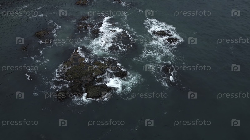 Вид сверху скалистых рифов возле океана. Клип. Волны врезаются в камни в море у скалистого побережья. Кинографический морской пейзаж камней недалеко от берега голубого моря