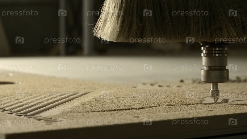 Ближайшее изображение деревянной резьбы с помощью машины, производящей узоры на деревянном доске.Креативное представление о столярстве