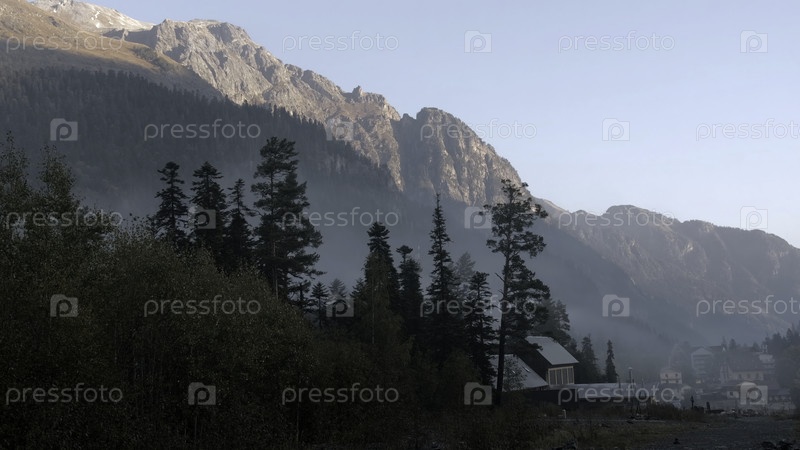 Восход солнца над горами и растущими деревьями.Креативно.Завораживающий фон дикой природы с горным хребтом на фоне