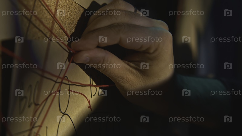 Клубовый снимок доски с записями и нитями. Фрагмент записи. Мужчина расследует и фиксирует доказательства на борту. Мужчина проверяет фотографии и заметки на исследовательской доске